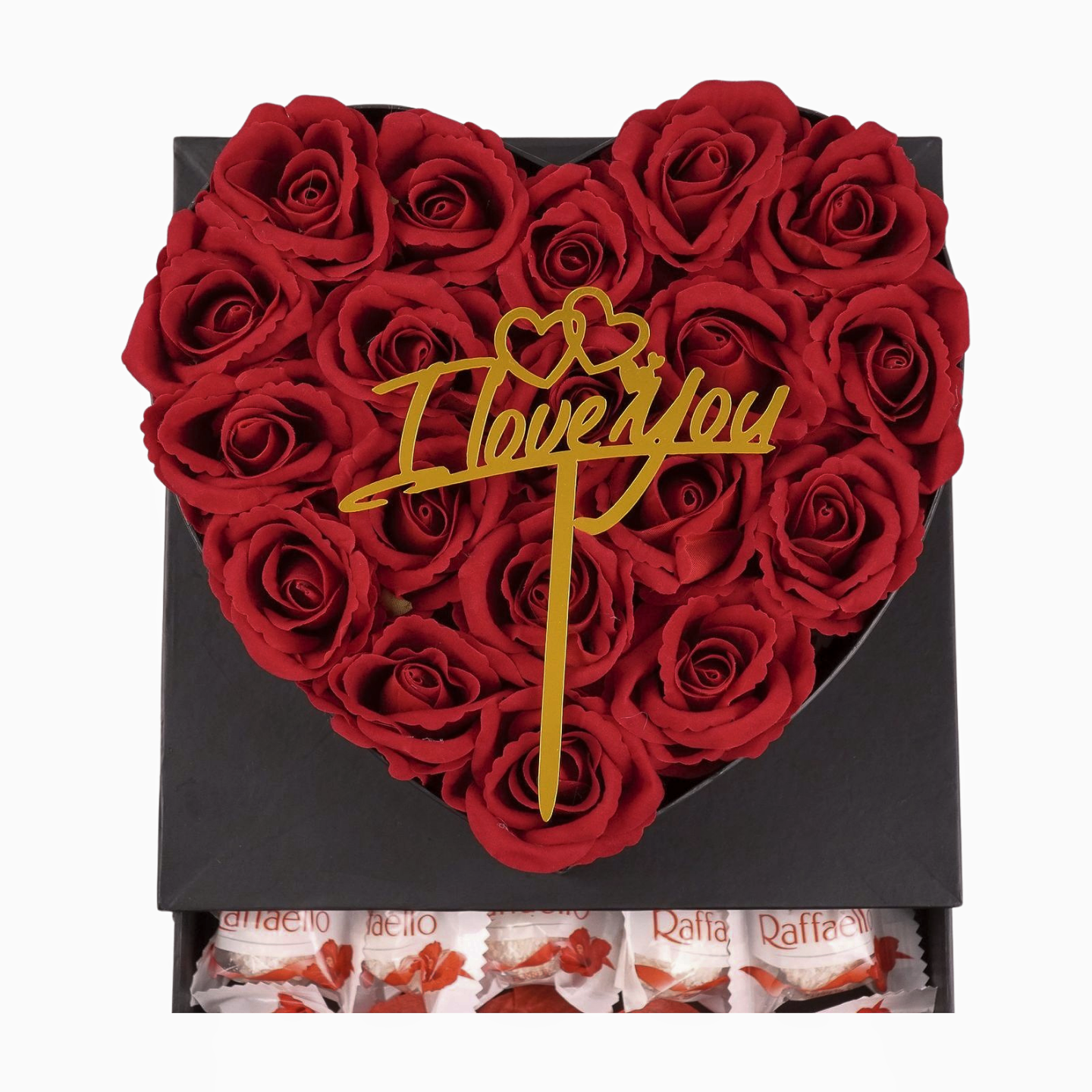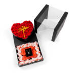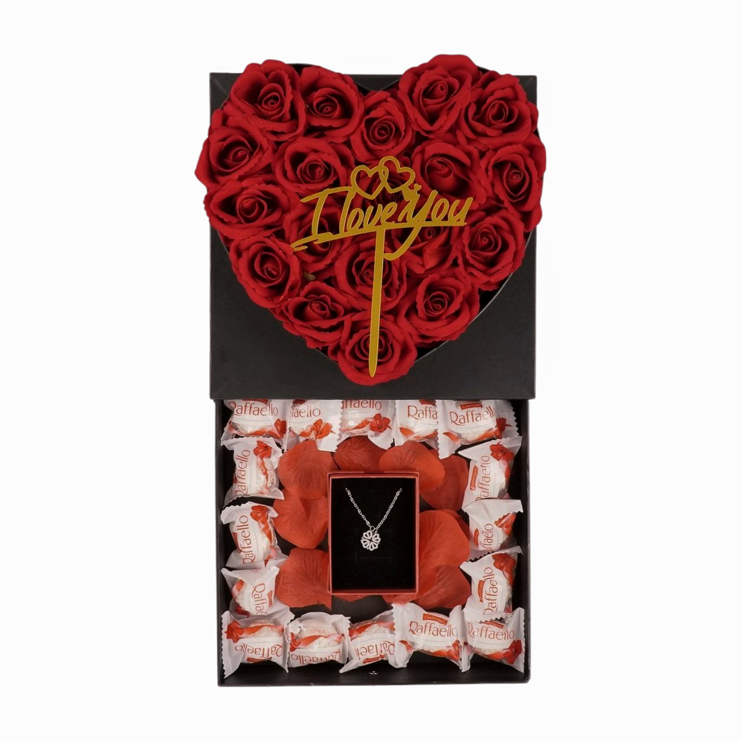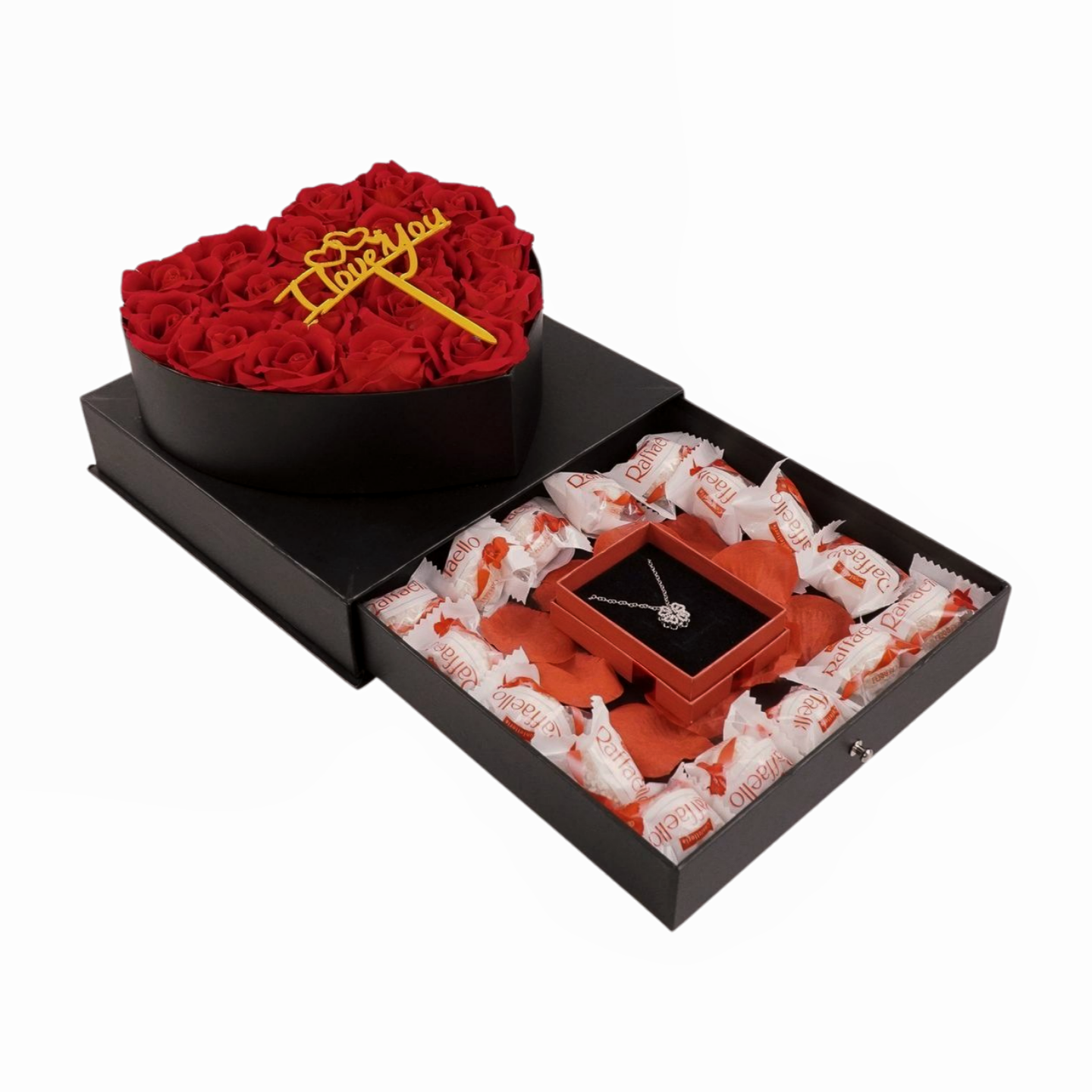 Подарокот содржи рачно изработени рози, чоколади и накит(доколку одберете).